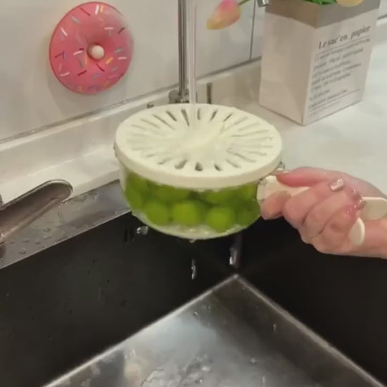 A basket or colander designed to rinse and strain fruits, veggies, pasta, etc.